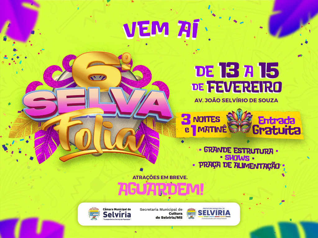 A Prefeitura de Selvíria, por meio da Secretaria Municipal de Cultura, confirmou a realização da 6ª edição do Selva Folia, tradicional evento de Carnaval do município. Com entrada gratuita, a festa promete movimentar a cidade, com atrações que serão divulgadas nos próximos dias.