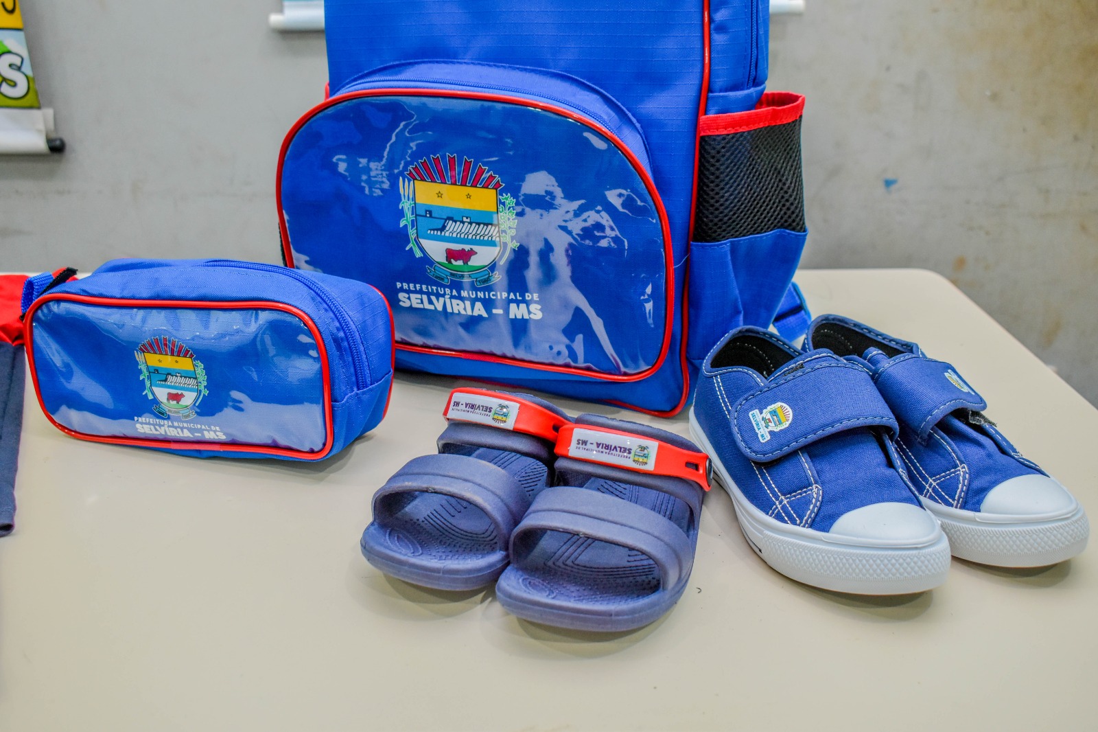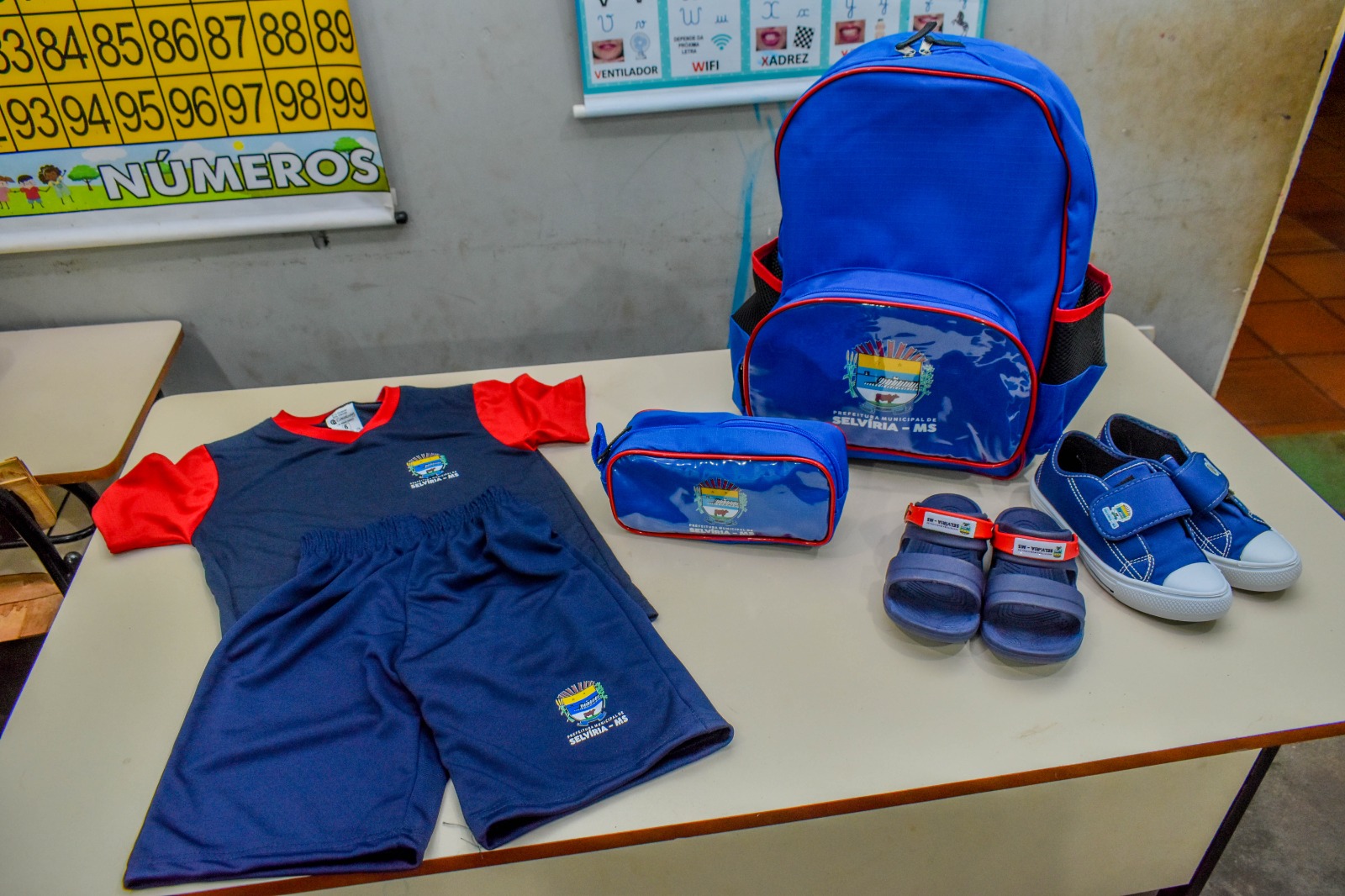 Cada estudante está recebendo um kit composto por duas camisetas, uma bermuda, uma mochila e um estojo. Para as crianças da educação infantil, o kit inclui ainda um par de tênis e um par de papete.
